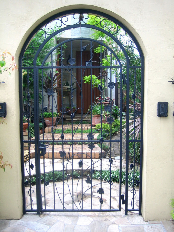 ブドウ装飾の門扉が周囲の植物にうまく溶け込んでいます。